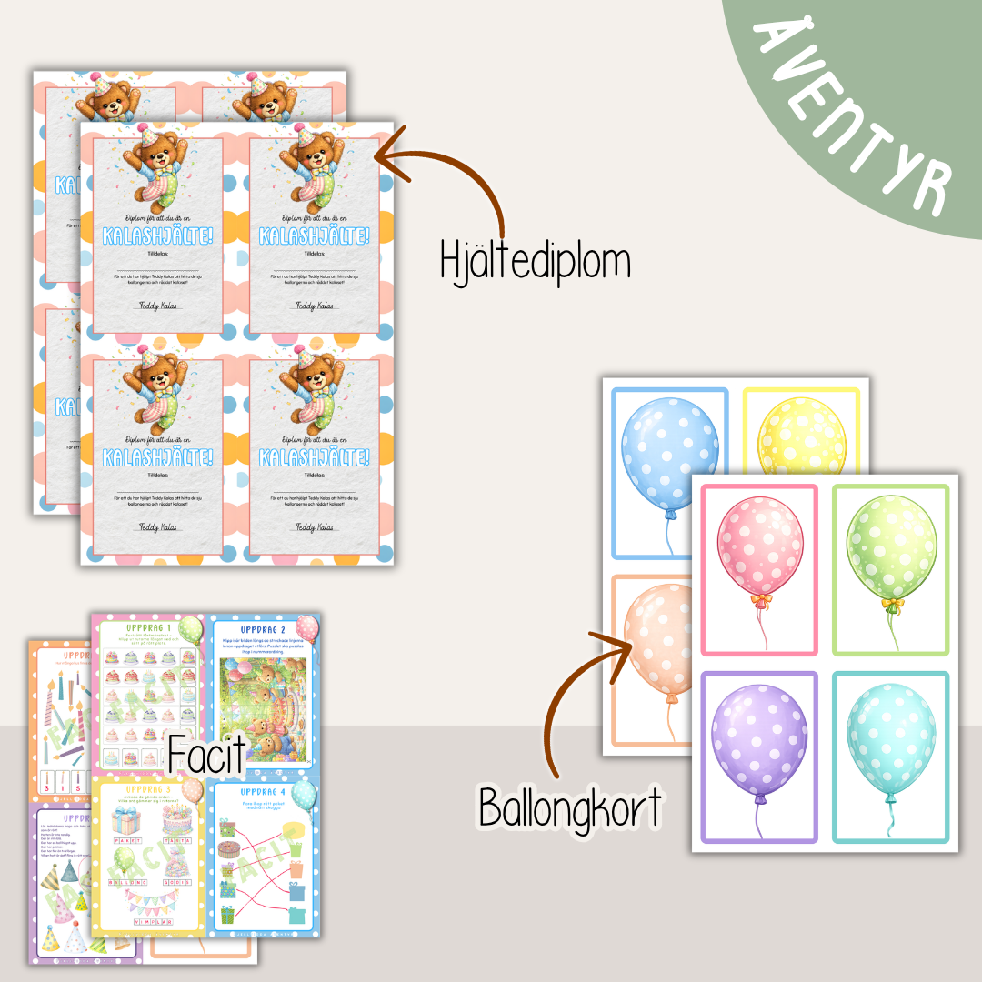 Teddy Kalas och jakten på ballongerna är ett färdigt kalasäventyr som levereras direkt hem till dig, tryckt på kraftigt kvalitetspapper och paketerat i en fin presentförpackning.
