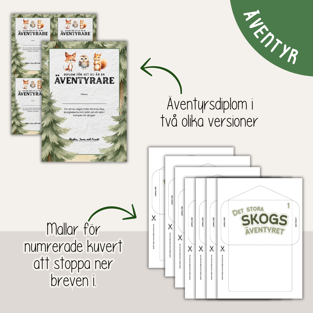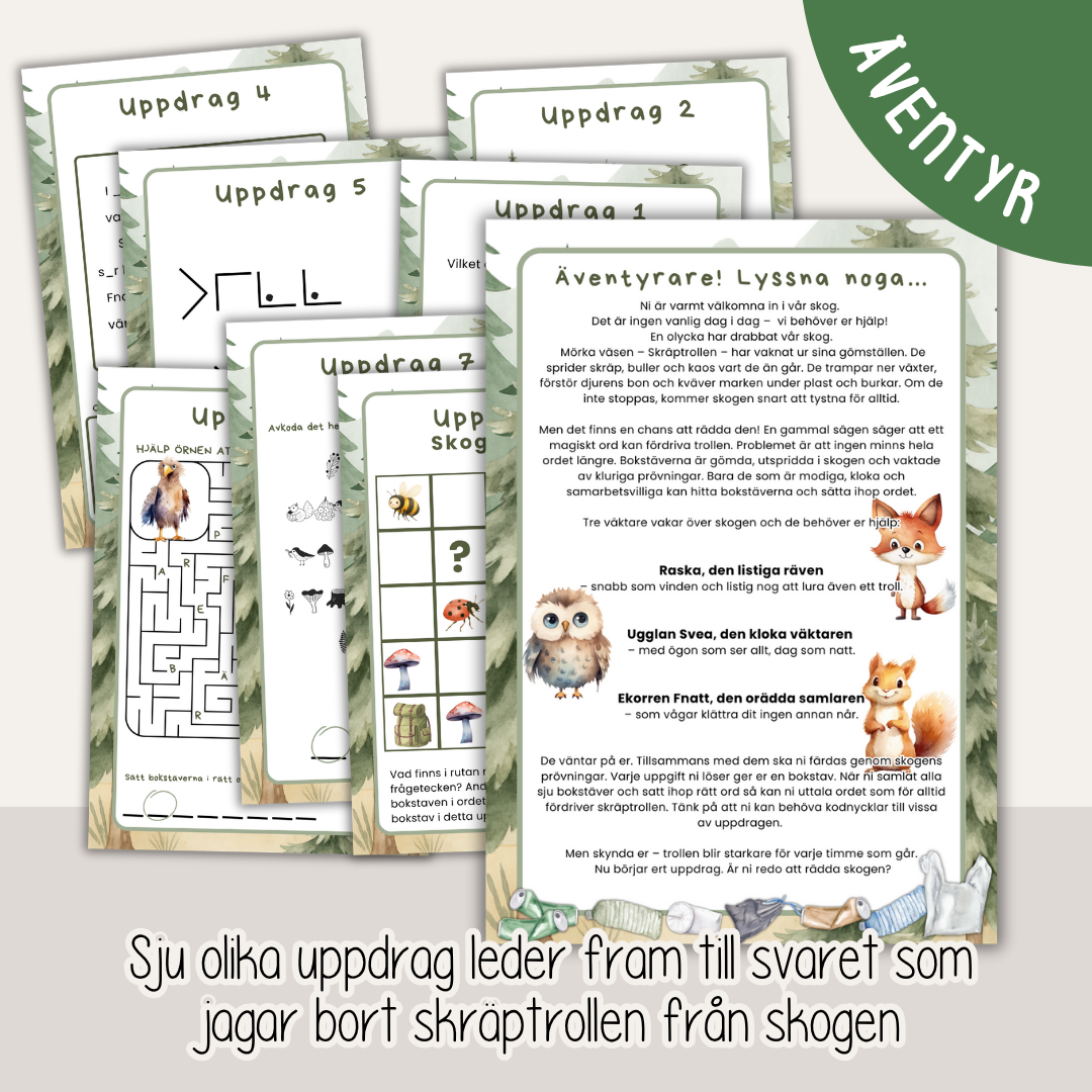 Ge barnen ett oförglömligt äventyr! I Det stora skogsäventyret ska deltagarna hjälpa skogens väktare, ekorren Fnatt, räven Raska och ugglan Svea, att rädda skogen från skräptrollen genom att lösa kluriga uppdrag, samla bokstäver och till slut avslöja det hemliga ordet som räddar skogen.
