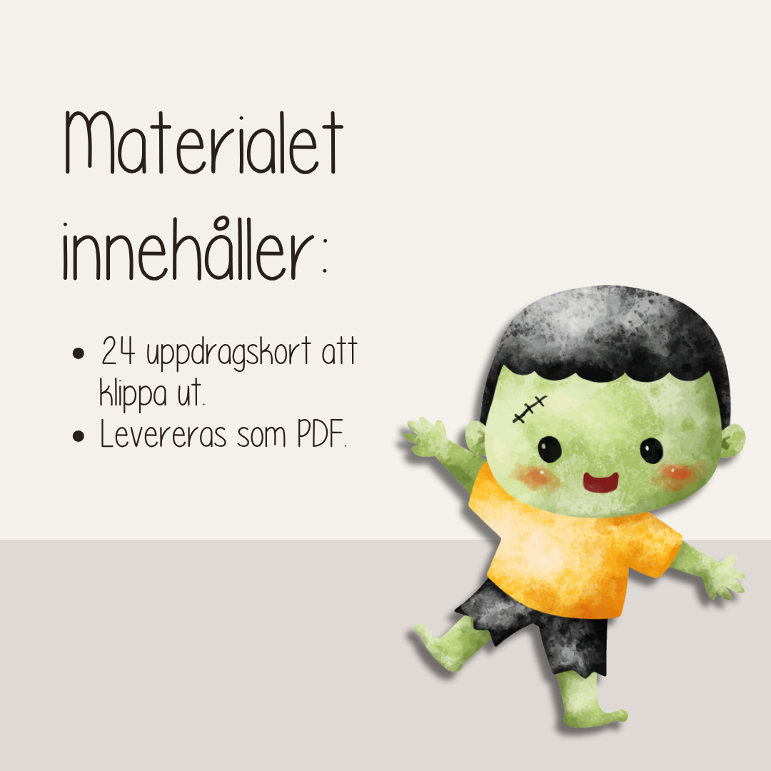 Perfekt till halloweenfesten, uteleken eller som en rolig stund hemma när energin behöver få utlopp. Skriv ut, klipp isär och använd om och om igen – ett lekfullt och skärmfritt sätt att skapa rörelseglädje tillsammans. Laminera gärna för bästa hållbarhet.