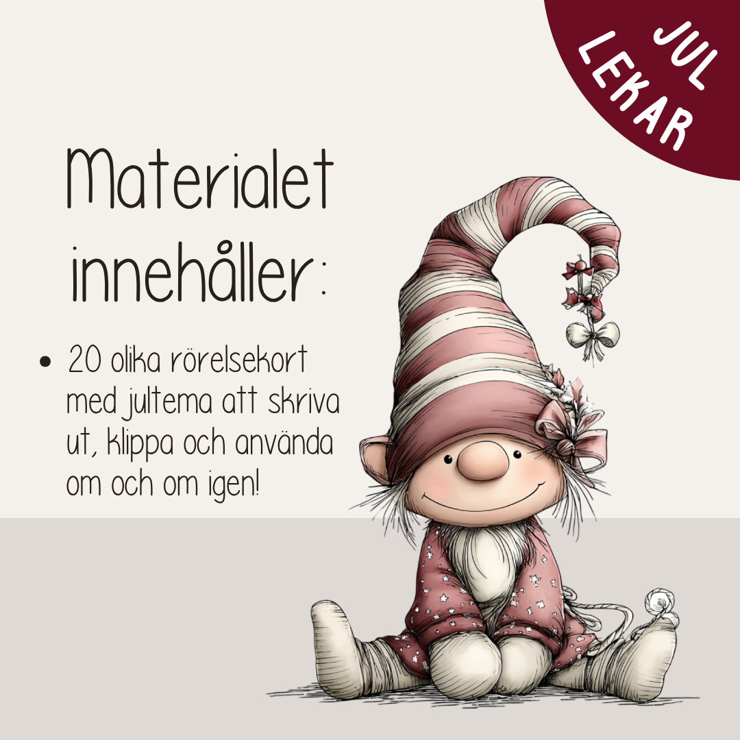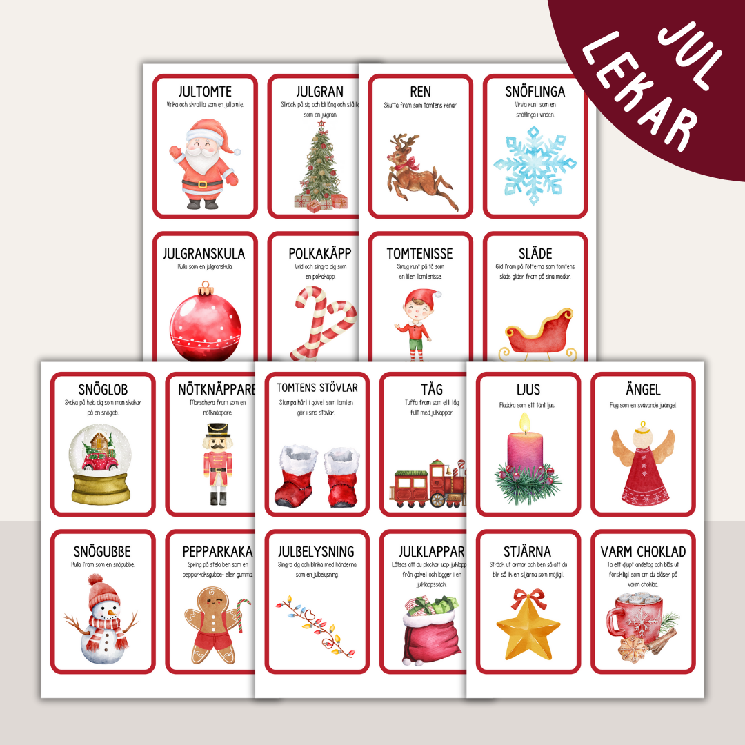 Få hela familjen i rörelse med dessa roliga uppdragskort på julens tema! På varje kort finns en bild och en uppmaning till rörelse – smyg som en tomtenisse, marschera som en nötknäppare, virvla runt som en snöflinga eller flyga som en julängel.