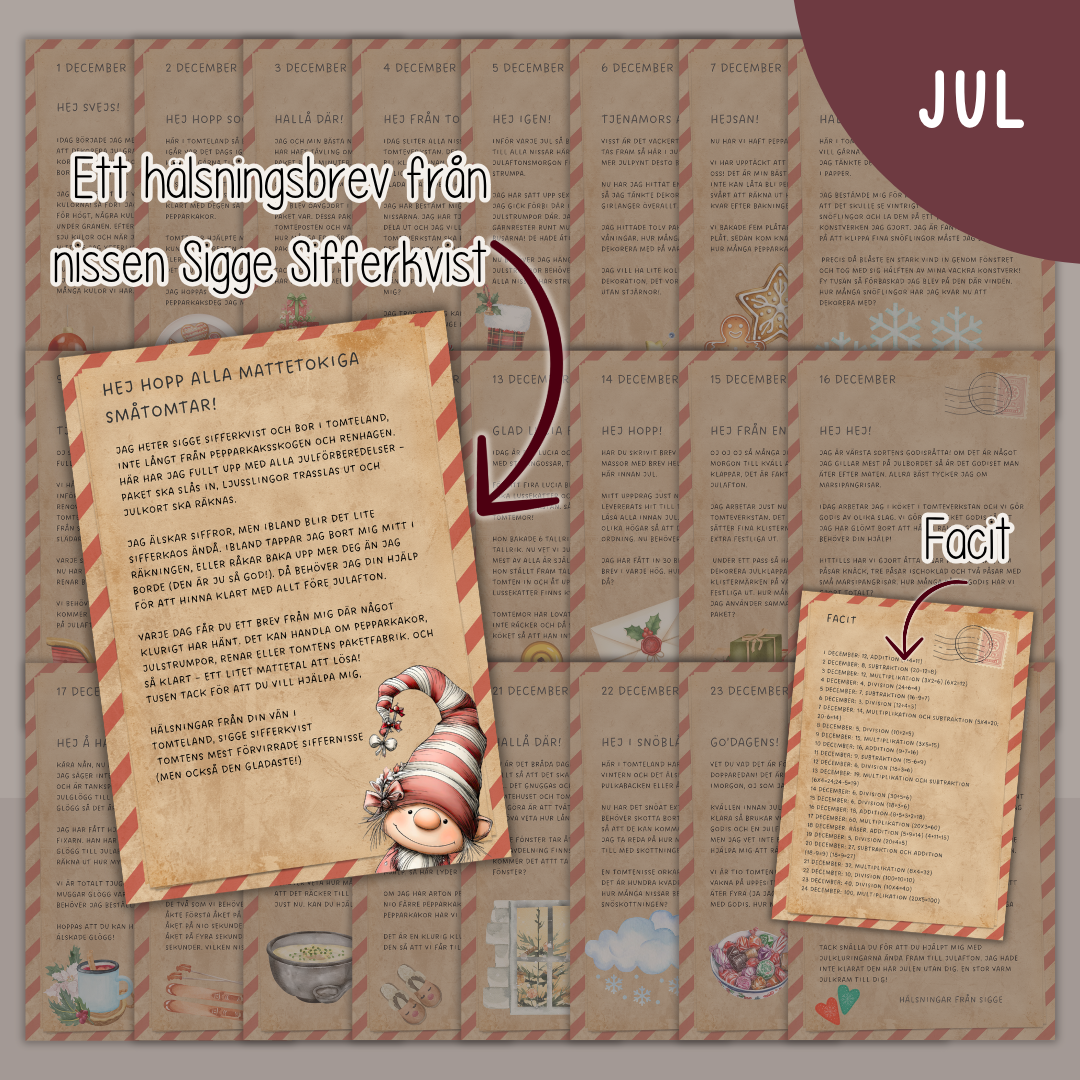 Låt Sigge Sifferkvist – Tomtens mest förvirrade (men gladaste!) siffernisse – flytta in hos er i december! Varje dag händer något klurigt i Tomteland, och barnen får ett nytt brev med ett mattetal att lösa.