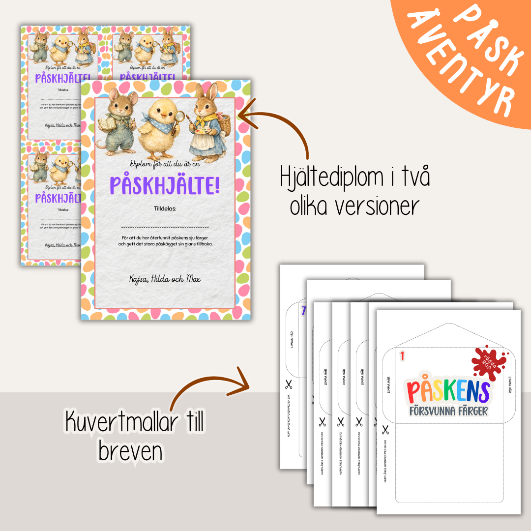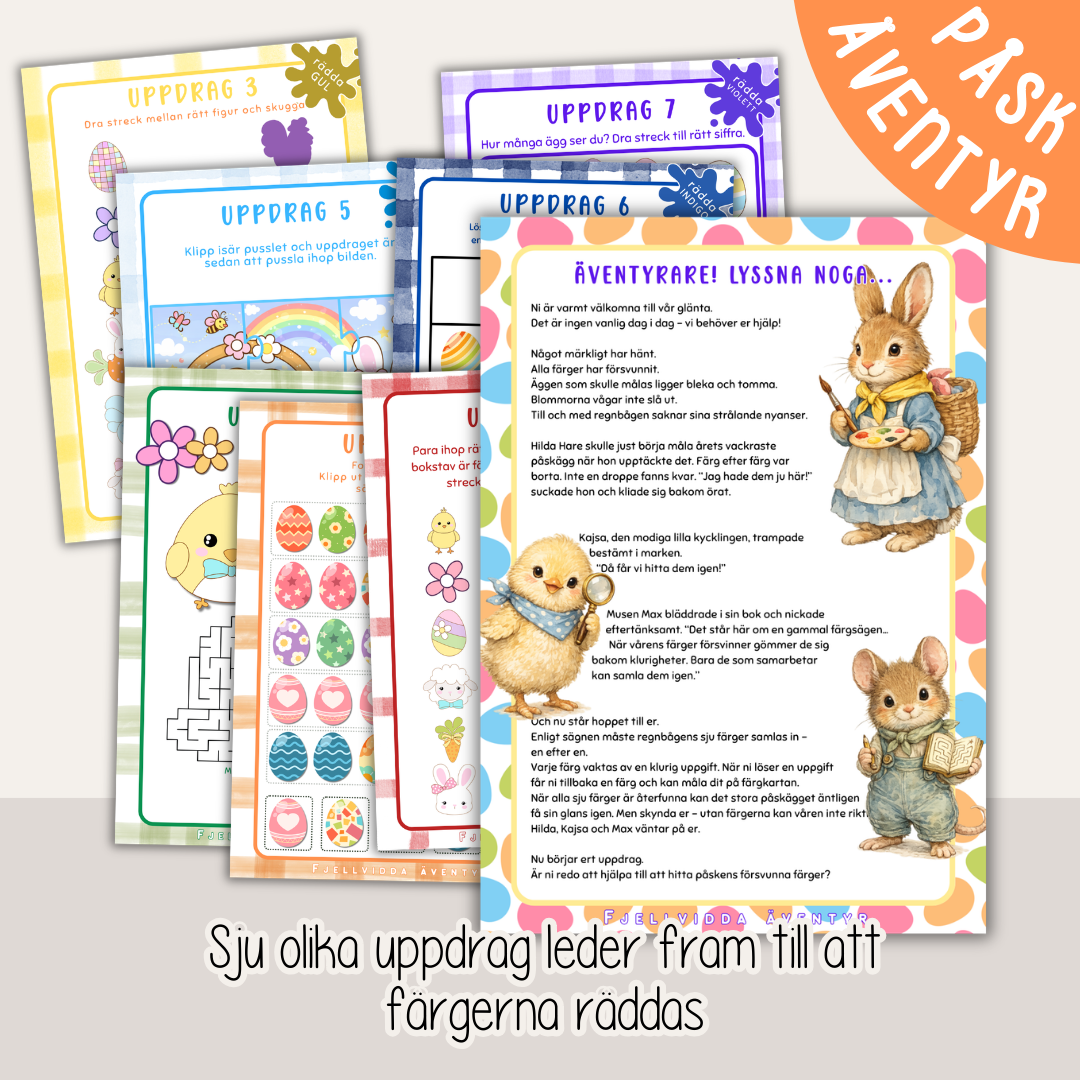 Barnen får följa ett lekfullt påskäventyr fyllt av sagobrev, enkla uppdrag och färgglad påskmagi. För varje uppdrag som löses återvänder en färg på den gemensamma färgkartan – tills alla färger är tillbaka och våren kan vakna igen.