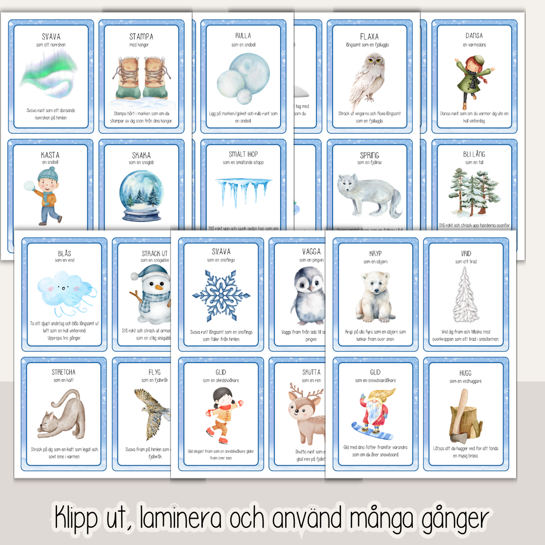Ett lekfullt och aktivt material med rörelsekort i vintertema som uppmuntrar barnen att röra på sig på olika sätt. Passar lika bra i klassrummet och på fritids som hemma i vardagsrummet eller på gården.