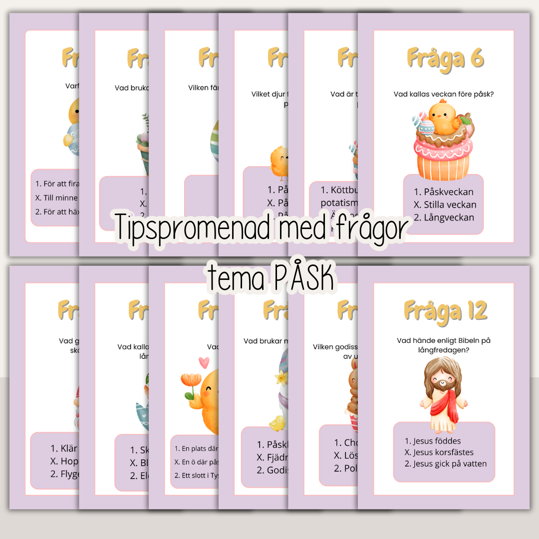 En rolig tipspromenad med 12 frågor om påsken. Perfekt som aktivitet under påskfirande, i skolan, på fritids eller hemma med familjen.