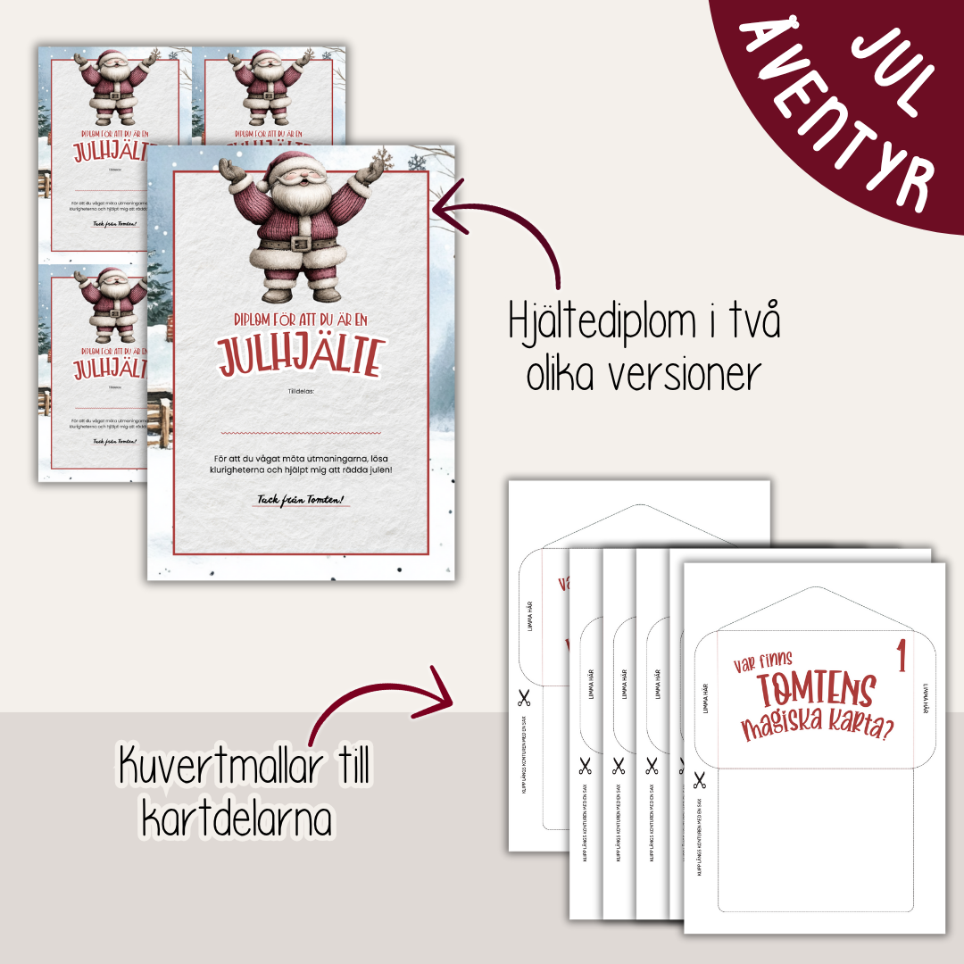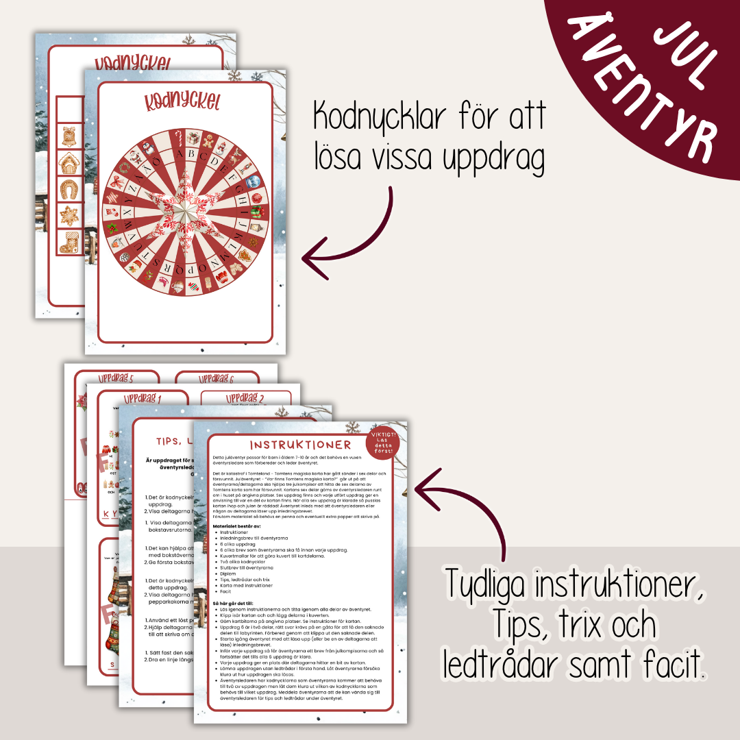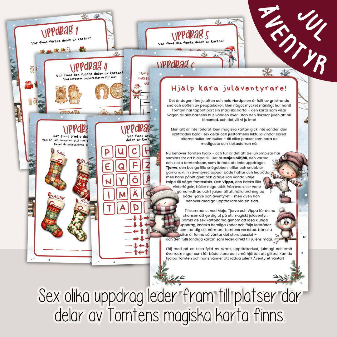 Samla barnen, lös uppdragen och pussla ihop kartan – och hjälp Tomten hitta vägen. Julen väntar på er! Tidsåtgång: ca 60–90 minuter, beroende på hur man lägger upp äventyret.