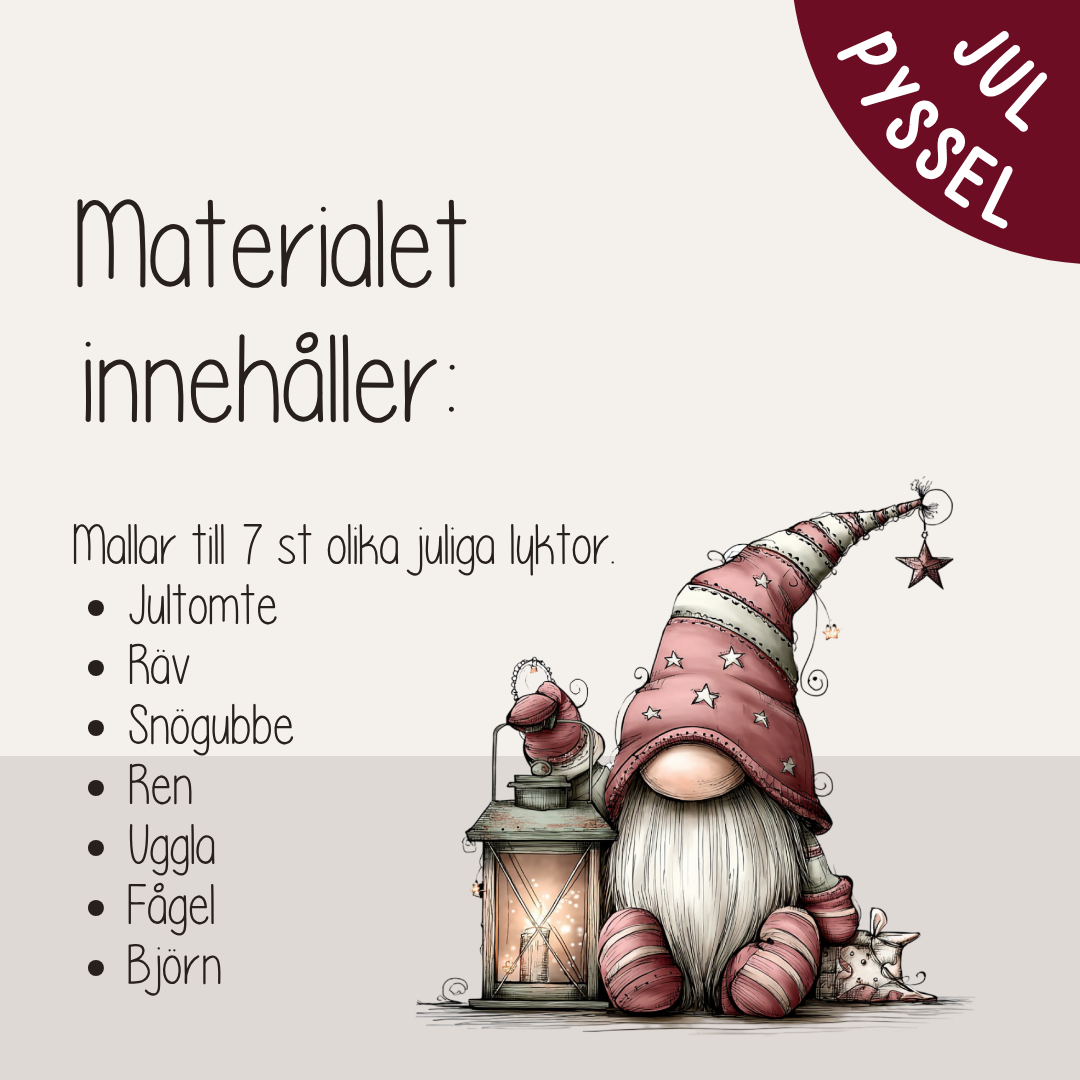 Detta pysselkitet innehåller sju ljuslyktor med olika julfigurer – redo att skrivas ut och skapas med. Ett enkelt, kreativt och skärmfritt julpyssel där både barn och vuxna kan hitta lugnet i klipp, färg och papper.