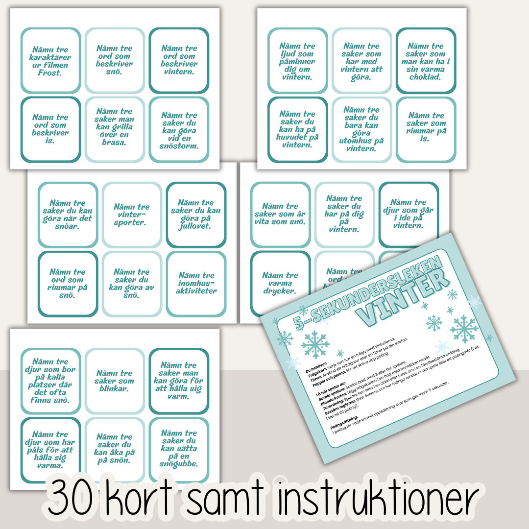 En rolig och fartfylld lek med vintertema där barnen drar ett kort och försöker komma på tre saker enligt uppdraget – på bara fem sekunder. Perfekt för skratt, tempo och spontanitet hemma, i skolan eller på fritids.