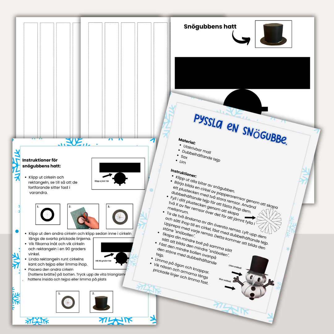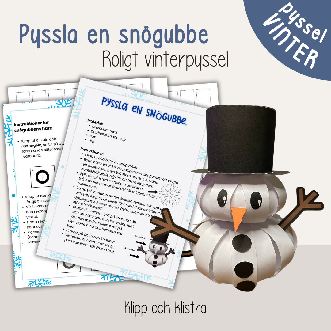 Ett roligt och enkelt vinterpyssel där barnen får bygga en snögubbe av pappersremsor. Klipp, forma och limma ihop delarna till en tredimensionell snögubbe – perfekt för kreativa vinterstunder hemma, i skolan eller på fritids.